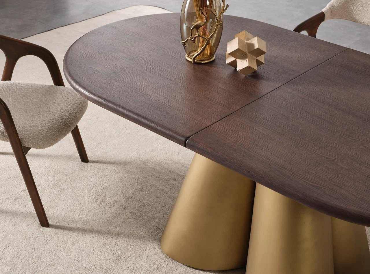 Masa Dining Extensibilă MANGO – Design Oval, Blat Nuc, Bază MDF Auriu
