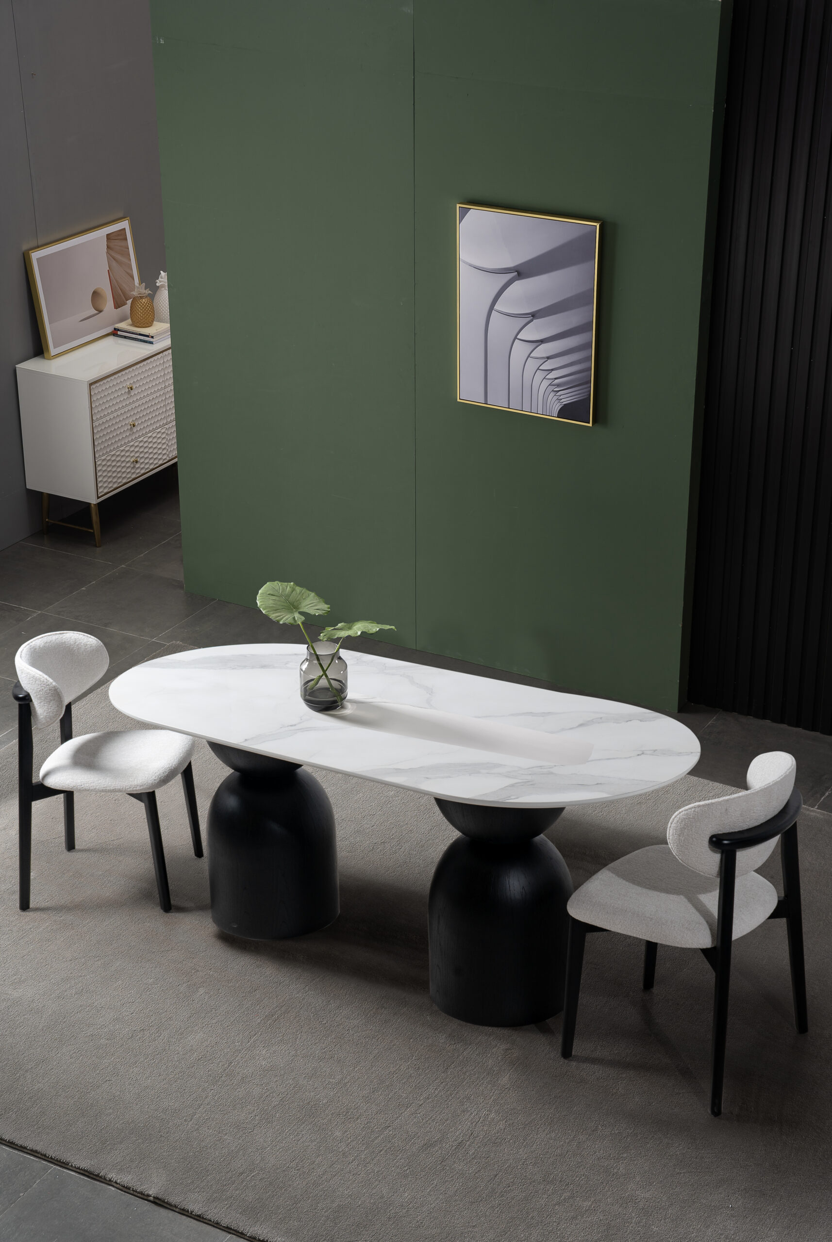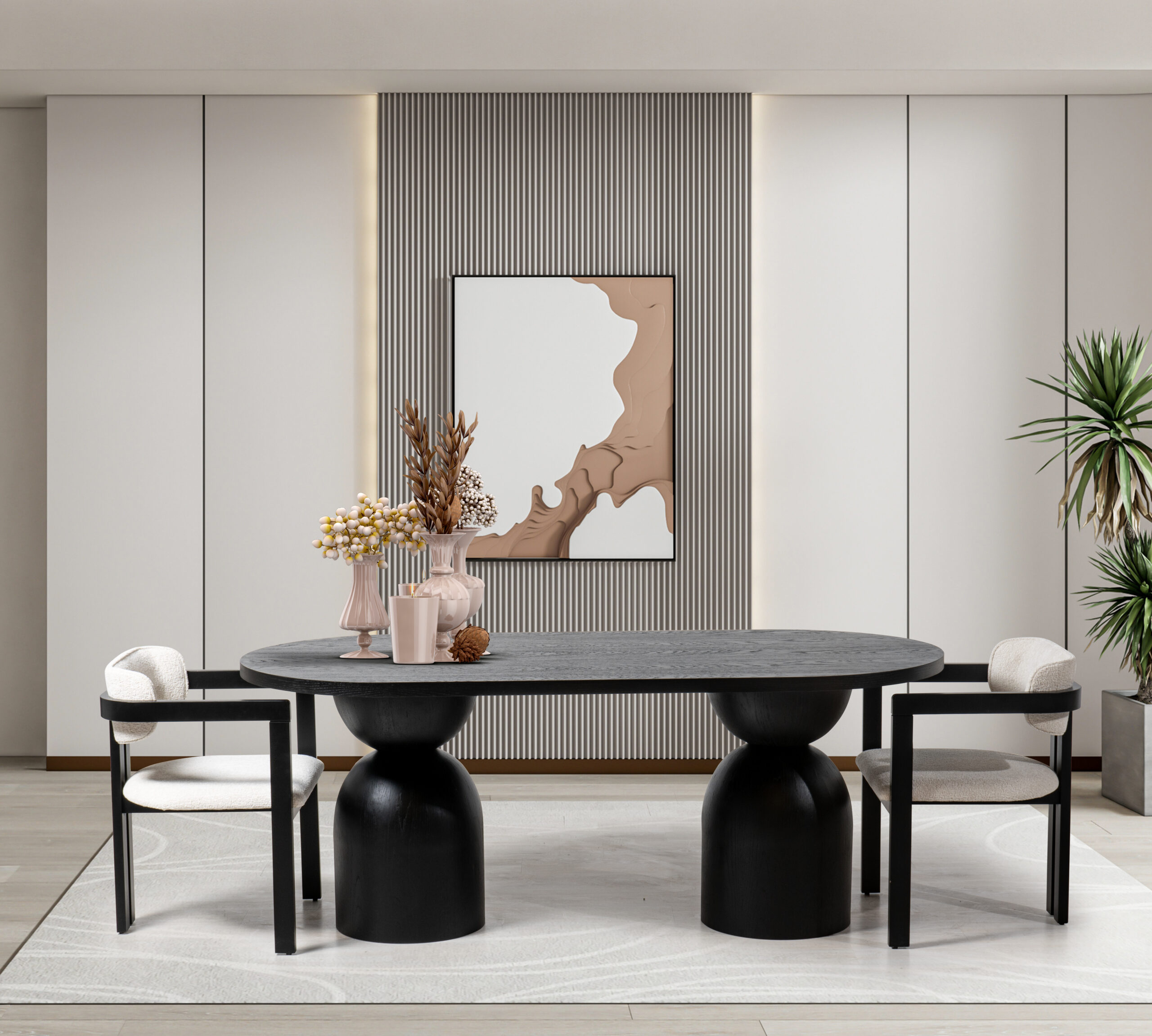 Masa dining SILEX este concepută pentru a deveni piesa centrală a locuinței dumneavoastră, oferind un echilibru perfect între estetica modernă și funcționalitate. Beneficiul major al acestui model este forma sa ovală generoasă, care permite așezarea confortabilă a invitaților și fluidizează circulația în living, eliminând colțurile ascuțite. Designul său impunător, susținut de elemente verticale robuste, aduce o notă de stabilitate și rafinament oricărui decor contemporan.