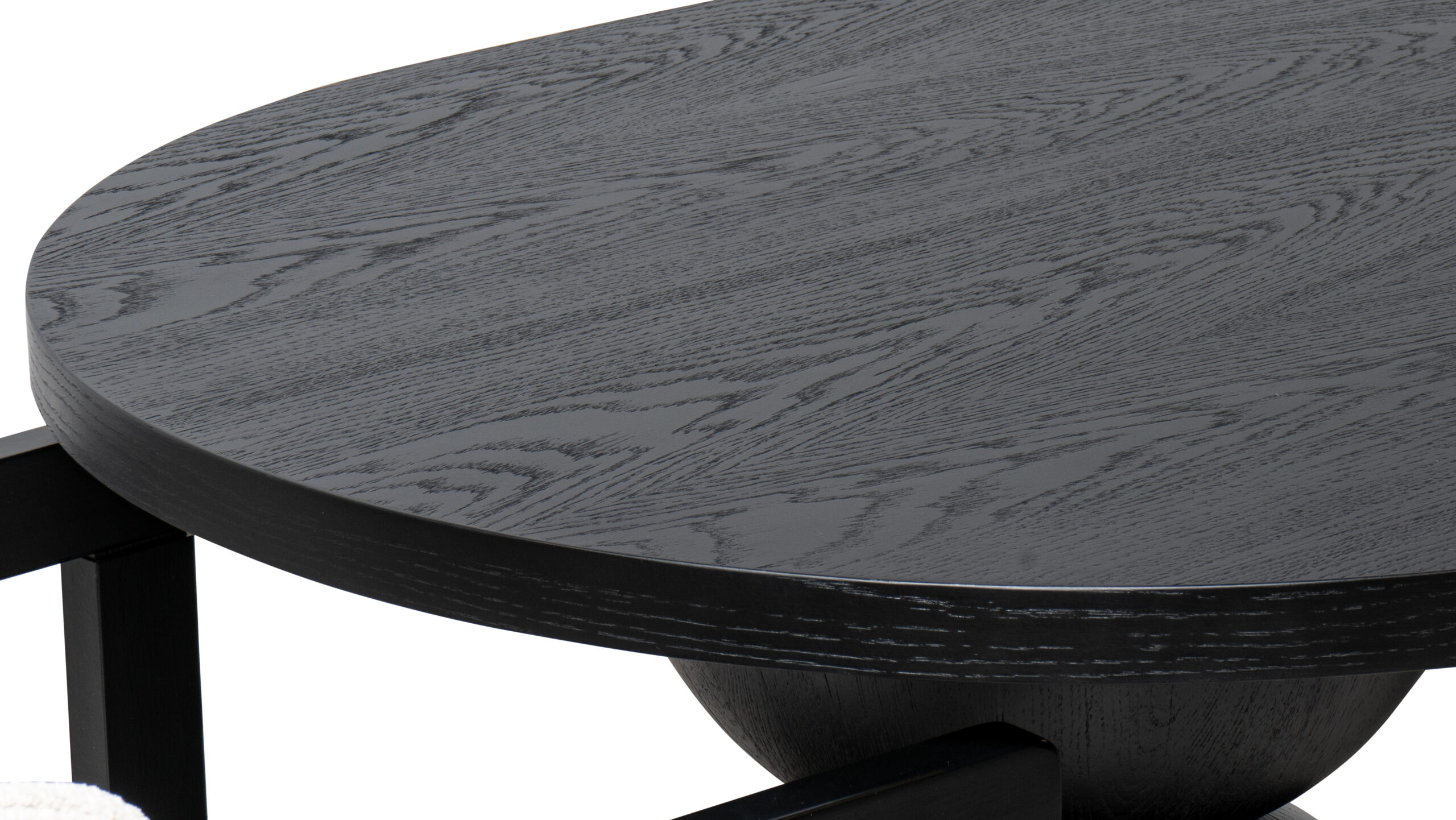 Masa SILEX se distinge prin blatul oval cu finisaje digitale spectaculoase și picioarele sculpturale placate cu lemn.