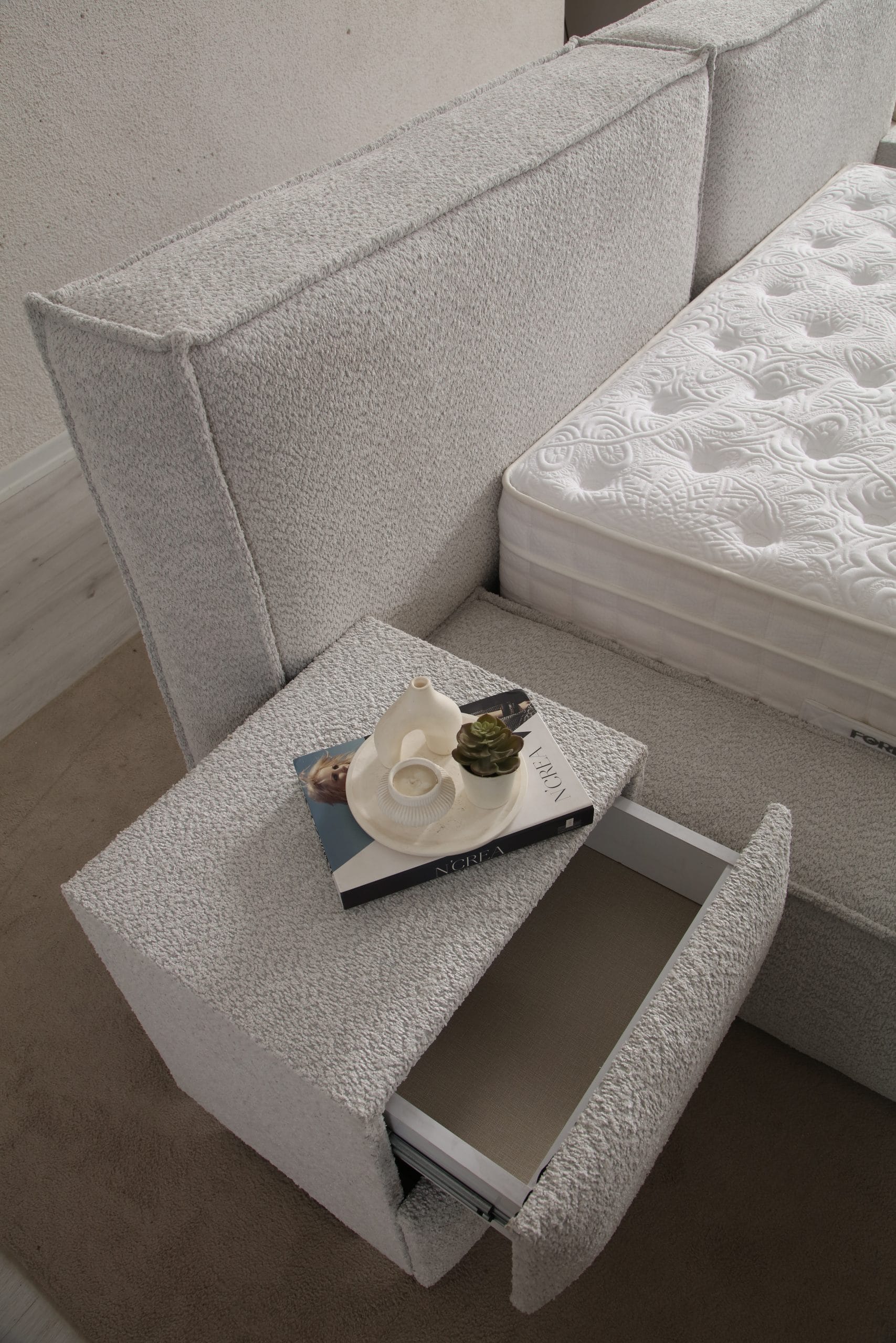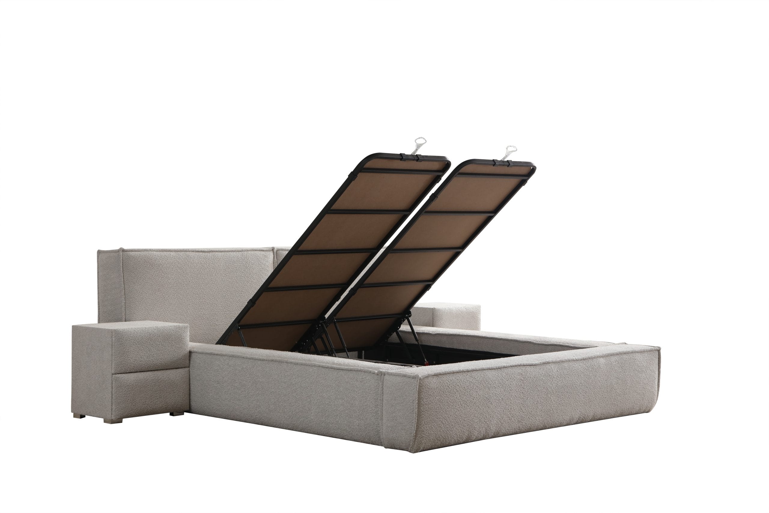 Dincolo de aspectul capitonat, Max Royal este construit pe o bază extrem de solidă. Somiera metalică rabatabilă asigură o susținere fermă și corectă pentru orice saltea, prevenind în timp deformările. Compartimentul de depozitare generos este integrat discret sub somieră, fiind accesibil printr-un sistem silențios cu pistoane pe gaz, perfect pentru eficientizarea spațiului din dormitor.